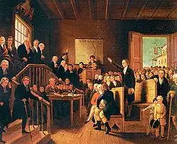 Patrick Henry was sworn into a sleepy session of the legislature on May 20; many of the members had left town. On about May 28, a ship arrived with an urgent letter from Montague: the Stamp Act had passed. On May 29, Henry introduced the Virginia Stamp Act Resolves.[29] The first two resolutions affirmed that the colonists had the same rights and privileges as Britons; the next two stated that taxation should be exacted only by one's representatives. The fifth was the most provocative, as it named the Virginia legislature, the General Assembly, as the representatives of Virginia empowered to tax. Two other resolutions were offered, though their authorship is uncertain.[30] Edmund and Helen Morgan, in their account of the Stamp Act crisis, suggest that Henry saw the Stamp Act as both a threat to Virginians' rights and an opportunity to advance himself politically.[31]