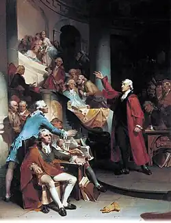 After the evidence was presented proving the facts at issue, Maury's counsel gave a speech in praise of the clergy, many of whom were in attendance. Henry responded with a one-hour speech, ignoring the question of damages, but which focused on the unconstitutionality of the veto of the Two Penny Act by the king's government. Henry deemed any king who annulled good laws, such as the Two Penny Act, as a "tyrant" who "forfeits all right to his subjects' obedience", and the clergy, by challenging an impartial law designed to bring economic relief, had shown themselves to be "enemies of the community".[20] The opposing counsel accused Henry of treason, and some took up that cry, but Henry continued, and the judge did nothing to stop him.[21] Henry urged the jury to make an example of Maury, for the benefit of any who might seek to imitate him and suggested the jury return damages of one farthing.[22] The jury was out for only moments and fixed damages at one penny. Henry was hailed as a hero. According to biographer Henry Mayer, Henry had "defined the prerogatives of the local elite by the unorthodox means of mobilizing the emotions of the lower ranks of religious and political outsiders."[23] Henry's popularity greatly increased, and he added 164 new clients in the year after the Parson's Cause.[24]