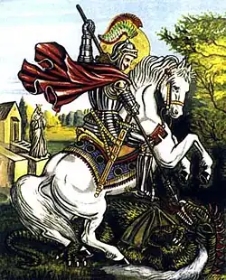 Due to the Christian influence on the Druze faith, two Christian saints become the Druze's favorite venerated figures: Saint George and Saint Elijah.[19] Thus, in all the villages inhabited by Druzes and Christians in central Mount Lebanon a Christian church or Druze maqam is dedicated to either one of them.[19] According to scholar Ray Jabre Mouawad the Druzes appreciated the two saints for their bravery: Saint George because he confronted the dragon and the Prophet Elijah because he competed with the pagan priests of Baal and won over them.[19] In both cases the explanations provided by Christians is that Druzes were attracted to warrior saints that resemble their own militarized society.[19]