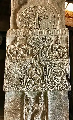 The use of stone carvings for storytelling is prevalent throughout the temple. The legends of Hindu epics and the Puranas are depicted on the temple pillars in the community hall. These stories span all major traditions within Hinduism, including Shaivism, Vaishnavism and Shaktism.[45] The rasa lila of Krishna, whose stories are found in the Bhagavata Purana, are shown on friezes as are Hindu fables from the Panchatantra.[45][47] Like other Hindu temples, the friezes of the Mallikarjuna temple show kama and mithuna scenes of amorous couples. In other places, artha scenes such as a worker walking with an elephant carrying a log and single women with different emotional expressions are carved into stone;[43][45] one of these women carries an 8th-century musical instrument.[46]