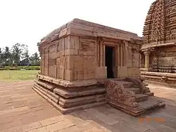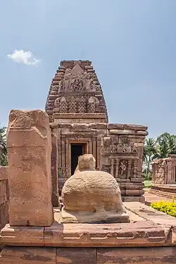 Although the temple is not the largest among those at Pattadakal it is nonetheless of imposing proportions.[33] The temple has a square layout,[38] with an east facing sanctum. The sanctum, surrounded by a covered pradakshina patha (circumambulatory path) lit by three carved windows. Inside the sanctum is a Shiva Linga. In front of the sanctum is a vestibule that is flanked on each side by smaller shrines. These shrines once contained carvings of Ganesha and Durga, but the carvings have since gone missing.[33] Further east of the hall is a seated Nandi. Past the vestibule is a mandapa within which are sixteen massive pillars set in groups of four, which may have been added after construction of the temple was completed.[33][34]