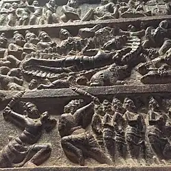 The temple has numerous friezes spanning a variety of topics such as, for example, two men wrestling, rishi with Vishnu, rishi with Shiva, Vishnu rescuing Gajendra elephant trapped by a crocodile in a lotus pond, scenes of hermitages, and sadhus seated in meditative yoga posture. Vedic deities such as Surya riding the chariot with Aruna, Indra on elephant and others are carved in stone.[60] A few depict scenes from the Ramayana such as those involving Angada (Vali's Son from Kishkindha Kingdom)sitting on a high chair made of his own magic tail and higher than the height of the ravana's throne, golden deer, Hanuman, Sugriva, Vali, Ravana and Jatayu bird, Sita being abducted, the struggles of Rama and Lakshmana. Other friezes show scenes from the Mahabharata, Vasudeva jailed in by Kamsa and birth of Sr krishna, Krishna's playful life story in the Bhagavata Purana and the Harivamsa as well as fables from the Panchatantra and other Hindu texts.[61][62][63]