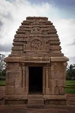 Another small temple, the Jambulingeshwara temple, also called the Jambulinga temple, is variously estimated by ASI and Michell to have been complete between mid 7th and early 8th century, respectively.[29][28] The temple is built around a square garbha griha (sacrum sanctum),[27] whose outer walls feature intricate devakoshtha (linteled niches with decorated frames with Hamsa and mythical makaras). Inside the frames are images of Vishnu on its north, Surya (Sun god) to its west and Lakulisha to the south.[29] The temple also experiments with the idea of projecting sukanasa from the shikhara in front, over the mandapa. The temple still faces east, greeting the sunrise. The Nandi too is provided with a raised platform which is in ruins and the Nandi image shows signs of erosion.[29][28] The dancing Shiva Nataraja with Parvati and Nandi by his side on the frontal arch sukanasa is better preserved.[28]
