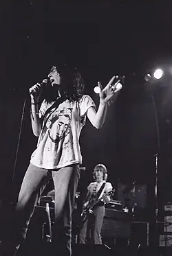 Later that year, the Patti Smith Group recorded their debut album, Horses, produced by John Cale amid some tension.[20] The album fused punk rock and spoken poetry and begins with a cover of Van Morrison's "Gloria", and Smith's opening words: "Jesus died for somebody's sins but not mine", an excerpt from "Oath", one of Smith's early poems. The austere cover photograph by Mapplethorpe has become one of rock's classic images.[23]