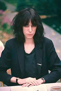 Patricia Lee Smith (born December 30, 1946) is an American singer, songwriter, poet, painter, author, and photographer. Her 1975 debut album Horses made her an influential member of the New York City–based punk rock movement.[1] Smith has fused rock and poetry in her work. In 1978, her most widely known song, "Because the Night," co-written with Bruce Springsteen, reached number 13 on the Billboard Hot 100 chart[1] and number five on the UK Singles Chart.