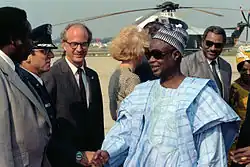 Cameroon–U.S. economic relations were at their highest ever level in 1982, when Ahidjo was replaced by his prime minister, Biya. Between 1982 and 1984, the U.S. overtook France as Cameroon's foremost export market, primarily due to its consumption of Cameroonian oil.[64] Biya pursued a diversification of Cameroonian foreign relations still more vigorously than Ahidjo had, describing his foreign policy in such terms as "diplomacy of development", "co-operation without frontiers", and "open door" diplomacy.[64]