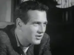 In February 1954, Newman appeared in a screen test with James Dean, directed by Gjon Mili, for East of Eden (1955). Newman was tested for the role of Aron Trask, Dean for the role of Aron's twin brother Cal. Dean won his part, but Newman lost out to Richard Davalos. That same year, as a last-minute replacement for Dean, he co-starred with Eva Marie Saint and Frank Sinatra in a live color television broadcast of Our Town, which was a musical adaptation of Thornton Wilder's stage play.[31] After Dean's death, Newman replaced Dean in the role of a boxer in a television adaptation of Hemingway's story "The Battler", written by A. E. Hotchner. It was broadcast live on October 18, 1955. That performance led to his breakthrough role as Rocky Graziano in the film Somebody Up There Likes Me in 1956.[32] The Dean connection had additional resonance. Newman was cast as Billy the Kid in The Left Handed Gun, which was a role originally earmarked for Dean. Additionally, Dean was originally cast to play the role of Rocky Graziano in Somebody Up There Likes Me; however, with his death, Newman got the role.[33][34]