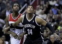 On June 28, 2013, the day of the NBA draft, the Boston Celtics and Brooklyn Nets reached a deal to trade Pierce, Kevin Garnett, and Jason Terry for future first-round picks in the 2014, 2016, and 2018 drafts and Kris Humphries, Gerald Wallace, Kris Joseph, MarShon Brooks, and Keith Bogans.[22] The deal was completed on July 12, 2013. Brooklyn also received D. J. White and the Celtics also received the right to swap first-round picks in the 2017 draft.[23] Pierce convinced Garnett to waive his no-trade clause so that the deal could come to fruition.[24] At an introductory press conference with Garnett and Terry following the trade, Pierce stated, "We are championship driven... We made a lot of money in our careers. We have won a number of awards. At this point right now, we are about winning a championship. Brooklyn gives us the best opportunity."[25]