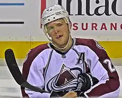 Before training camp, he was not expected to start the season with the Avalanche, but rather for a minor league affiliate team.[2][18] However, Steve Konowalchuk's career-ending heart problem opened a roster spot and Stastny's play impressed Avalanche coach Joel Quenneville.[18][32] He started the season with the jersey number 62 until his teammate John-Michael Liles switched to jersey number 4 to let Stastny use 26, the number that his father had worn when he played for the Nordiques.[33] Stastny had his first NHL assist on a goal by Wojtek Wolski in his third NHL game, on October 8, 2006, against the Vancouver Canucks.[34][35] On October 21, in his eighth NHL game and his first wearing jersey number 26, Stastny scored his first NHL goal in Montreal against David Aebischer of the Montreal Canadiens.[36]