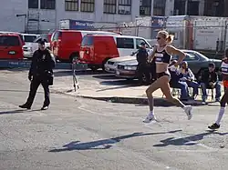 Starting 2000, Radcliffe won the Stormont Cross Country race for a third time.[50] Radcliffe then finished fourth in Durham.[51][52][53] Radcliffe then sustained a knee injury.[54] For the European Cup, Radcliffe joined a host of other British athletes by pulled out injured.[55] However, Radcliffe soon returned to the track for the first time since March after a virus, a knee operation and a calf muscle tear had kept her out; to race over 1,500 metres in Barcelona.[56] In her first race since the World Cross Country, Radcliffe finished 11th.[57] At the London Grand Prix, Radcliffe finished second, one second outside of her British record, in only her second track race of the season.[58] At the Weltklasse Zürich IAAF Golden League meeting Radcliffe competed in the 3,000 metres and finished in fourth place.[59] At the UK trials won the 5,000 metres title.[60] The British Grand Prix saw Radcliffe race over 3000 metres, where once again she finished third.[61] At the 2000 Olympic Games in Sydney, Radcliffe finished sixth in her 10,000 metres heat to qualify for the final.[62] In the final Radcliffe set a new British record, but crossed the line in fourth and was highly disappointed to miss out on a medal.[63] Radcliffe returned to action by winning the BUPA Ireland five-mile race.[64] At the Great North Run, Radcliffe ran a new European record for the half marathon, as she won the race in a time of 67 minutes and 7 seconds.[65] Radcliffe was then selected for the 2000 IAAF World Half Marathon Championships in Mexico.[66] Radcliffe won her first World title, despite suffering a panic attack when her nose tape, designed to help her breathe, fell off halfway round.[67] The good run of form came to an end, when she turned her attention to the Cross Country events and finished third in Brussels.[68] Radcliffe confirmed that her last race of the year would be the Great North Cross Country.[69] There Radcliffe defeated Tulu by seventy-five seconds,[70] in eight inches of snow.[71]