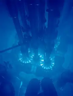 In Starship Troopers, spaceships travel faster than light using Cherenkov Drive.