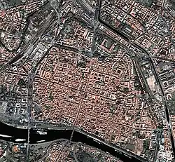 Aerial photo of the historic center of Pavia; the urban plan of the Roman age is evident.