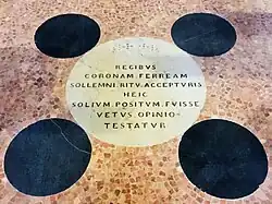 Basilica of San Michele Maggiore, the five stones, already mentioned in the Honorantiae civitatis Papiae (about 1020), above which the throne was placed during coronations