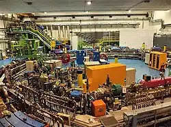 The CNAO uses a synchrotron where particles are produced in two sources, these are pre-accelerated by a linear accelerator and sent to an injection line for transfer into the synchrotron ring, where they are further accelerated and extracted.[163]