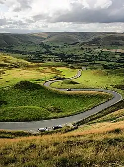 The Peak District forms the southern extremity of the Pennines.[6] Much of it is upland above 1,000 feet (300 m), its highest point being Kinder Scout at 2,087 ft (636 m).[7] Despite its name, the landscape has fewer sharp peaks than rounded hills, plateaus, valleys, limestone gorges and gritstone escarpments (the "edges").[8][9] The mostly rural area is surrounded by conurbations and large urban areas, including Manchester, Huddersfield, Sheffield, Derby and Stoke-on-Trent.
