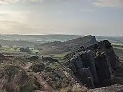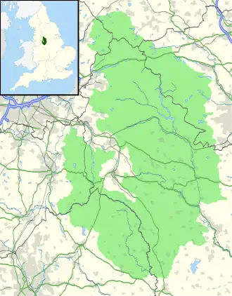 Outside the park, the wider Peak District extends from the gritstone moorlands of the South Pennines to the north, separated approximately by the Tame Valley, Standedge and Holme Valley.[14] It continues south and roughly ends at the Weaver Hills near the Churnet Valley.[15][16] It often includes the area approximately between Disley and Sterndale Moor, encompassing Buxton and the Peak Dale corridor. It may also include some of the outer fringes and foothills, such as the Churnet[17] and lower Derwent Valleys,[18] and the area approximately between The Cloud and Mow Cop.[19] Conversely, while the rural west of the City of Sheffield falls in the park boundaries, the urban area of the city is usually excluded,[20] alongside the other surrounding large urban areas. The rest of the region is surrounded by lowlands,[21] including the Cheshire Plain[22] and Greater Manchester Built-up Area[23] to the west. The Derbyshire and Yorkshire Coalfields lie to the east[24] while the lowlands of the Midlands are to the south, near the north of the Trent Valley.[25]