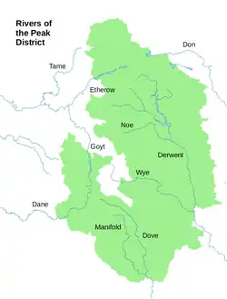 The rivers Noe and the Wye are tributaries.[41] The River Manifold[42] and River Dove[43] in the south-west, whose sources are on Axe Edge Moor, flow into the Trent. The River Dane flows into the River Weaver in Cheshire.[44]