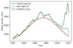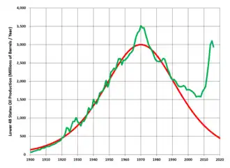 By observing past discoveries and production levels, and predicting future discovery trends, the geoscientist M. King Hubbert used statistical modelling in 1956 to predict that United States oil production would peak between 1965 and 1971.[121] While this prediction held for many decades,[122] more recently as of 2018 daily oil production in the United States had finally exceeded its previous peak in 1970.[123][124] Hubbert used a semi-logistical curved model (sometimes incorrectly compared to a normal distribution). He assumed the production rate of a limited resource would follow a roughly symmetrical distribution. Depending on the limits of exploitability and market pressures, the rise or decline of resource production over time might be sharper or more stable, appear more linear or curved.[125] That model and its variants are now called Hubbert peak theory; they have been used to describe and predict the peak and decline of production from regions, countries, and multinational areas.[125] The same theory has also been applied to other limited-resource production.