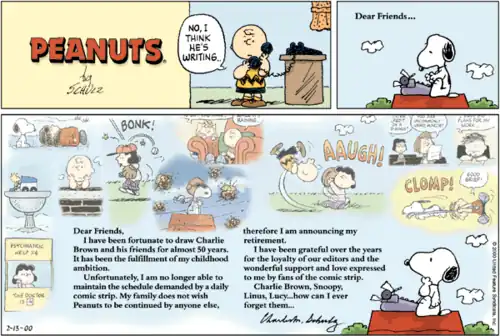 The last daily strip appeared on January 2, 2000. The last Sunday strip, concluding the strip as a whole, appeared on February 13, 2000. Schulz died in his sleep in his Santa Rosa, California, home on February 12, the night before the last strip; commentators have noted the close timing of these two events as unusual.[2] Michaelis surmised, "To the very end, his life had been inseparable from his art. In the moment of ceasing to be a cartoonist, he ceased to be".[78]