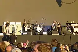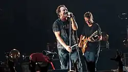 ![]() Pearl Jam in New York City in 2016. From left to right: Mike McCready, Jeff Ament, Eddie Vedder, Matt Cameron, Stone Gossard and session/touring musician Boom Gaspar. | |
