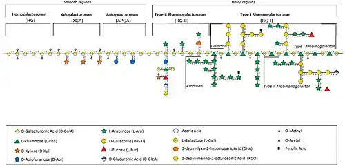 Pectin is often described as having alternating ‘smooth’ and ‘hairy’ regions, with the ‘hairy’ regions representing the branched rhamnogalacturonan I and rhamnogalacturonan II, and the ‘smooth’ regions corresponding to the linear homogalacturonan backbone.[21] More specifically, pectin consists of different galacturonic acid–containing domains—mainly homogalacturonan (HG), rhamnogalacturonan I (RG-I), and rhamnogalacturonan II (RG-II)—which differ in their sugar composition and linkage patterns. Additionally, xylogalacturonan (XGA) and apiogalacturonan (APGA) are often considered to be pectin because they have the same backbone as homogalacturonan.[19]