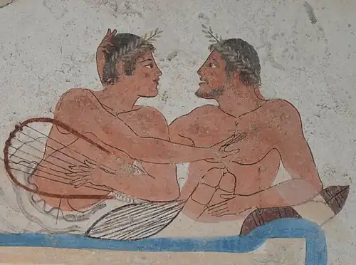 The erastês-erômenos relationship played a role in the Classical Greek social and educational system, had its own complex social-sexual etiquette and was an important social institution among the upper classes.[30] Pederasty has been understood as educative,[31] and Greek authors from Aristophanes to Pindar felt it naturally present in the context of aristocratic education (paideia).[32] In general, pederasty as described in Greek literary sources is an institution reserved for aristocrats, perhaps to be regarded as a dyadic mentorship which sometimes could take a physical dimension.[33] The scene of Xenophon's Symposium, and also that of Plato's Protagoras, is set at Callias III's house during a banquet hosted by him for his beloved Autolykos in honour of a victory gained by the handsome young man in the pentathlon at the Panathenaic Games.[34]
