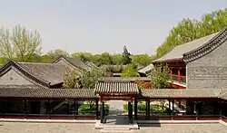 The university campus is on the former site of Qing dynasty imperial gardens and it retains traditional Chinese-style landscaping, including traditional houses, gardens, pagodas, and notable historical buildings and structures. American architect and art historian Talbot Hamlin designed some of the university's buildings constructed during the 1919 to 1922 period.[23] There are several gates that lead into campus — East, West and South gates, with the West Gate being the most well known for the painted murals on its ceiling. Weiming Lake is in the north of the campus and is surrounded by walking paths and small gardens. The university hosts many museums, such as the Museum of University History and the Arthur M. Sackler Museum of Art and Archaeology.[24][25] Notable items in these museums include funerary objects that were excavated in Beijing and date back thousands of years from the graves of royals of the Warring States period. There are ritual pottery vessels as well as elaborate pieces of jewelry on display. There are also human bones set up in the traditional burial style of that period.[25]