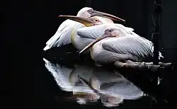Pelicans have mainly light-coloured plumage, the exceptions being the brown and Peruvian pelicans.[55] The bills, pouches, and bare facial skin of all species become brighter before breeding season commences.[56] The throat pouch of the Californian subspecies of the brown pelican turns bright red, and fades to yellow after the eggs are laid, while the throat pouch of the Peruvian pelican turns blue. The American white pelican grows a prominent knob on its bill that is shed once females have laid eggs.[5] The plumage of immature pelicans is darker than that of adults.[55] Newly hatched chicks are naked and pink, darkening to grey or black after four to 14 days, then developing a covering of white or grey down.[57]