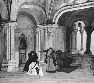 At this point, Debussy too was a devotee of Wagner's music, but—eager to please his father—he was probably more swayed by Mendès' promise of a performance at the Paris Opéra and the money and reputation this would bring. Mendès' libretto, with its conventional plot, offered rather less encouragement to his creative abilities.[7] In the words of critic Victor Lederer, "Desperate to sink his teeth into a project of substance, the young composer accepted the type of old-fashioned libretto he dreaded, filled with howlers and lusty choruses of soldiers calling for wine."[8] Debussy's letters and conversations with friends reveal his increasing frustration with the Mendès libretto, and the composer's enthusiasm for the Wagnerian aesthetic was also waning. In a letter of January 1892, he wrote, "My life is hardship and misery thanks to this opera. Everything about it is wrong for me." And to Paul Dukas, he confessed that Rodrigue was "totally at odds with all that I dream about, demanding a type of music that is alien to me."[9]