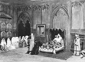 Mélisande sleeps in a sick bed after giving birth to her child. The doctor assures Golaud that despite her wound, her condition is not serious. Overcome with guilt, Golaud claims he has been killed for no reason. Pelléas and Mélisande merely kissed "like a brother and sister". Mélisande wakes and asks for a window to be opened so she can see the sunset. Golaud asks the doctor and Arkel to leave the room so he can speak with Mélisande alone. He blames himself for everything and begs Mélisande's forgiveness. Golaud presses Mélisande to confess her forbidden love for Pelléas. She maintains her innocence despite Golaud's increasingly desperate pleas to her, to tell the truth. Arkel and the doctor return. Arkel tells Golaud to stop before he kills Mélisande, but he replies, "I have already killed her." Arkel hands Mélisande her newborn baby girl but she is too weak to lift the child in her arms and remarks that the baby does not cry and that she will live a sad existence. The room fills with serving women, although no one can tell who has summoned them. Mélisande quietly dies. At the moment of death, the serving women fall to their knees while tearfully mourns Mélisande. Arkel comforts the grief-stricken Golaud.[60]