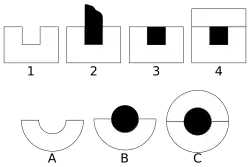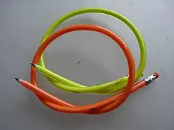 The lead of the pencil is a mix of finely ground graphite and clay powders. Before the two substances are mixed, they are separately cleaned of foreign matter and dried in a manner that creates large square cakes. Once the cakes have fully dried, the graphite and the clay squares are mixed together using water. The amount of clay content added to the graphite depends on the intended pencil hardness (lower proportions of clay makes the core softer),[57] and the amount of time spent on grinding the mixture determines the quality of the lead. The mixture is then shaped into long spaghetti-like strings, straightened, dried, cut, and then tempered in a kiln. The resulting strings are dipped in oil or molten wax, which seeps into the tiny holes of the material and allows for the smooth writing ability of the pencil. A juniper or incense-cedar plank with several long parallel grooves is cut to fashion a "slat," and the graphite/clay strings are inserted into the grooves. Another grooved plank is glued on top, and the whole assembly is then cut into individual pencils, which are then varnished or painted. Many pencils feature an eraser on the top and so the process is usually still considered incomplete at this point. Each pencil has a shoulder cut on one end of the pencil to allow for a metal ferrule to be secured onto the wood. A rubber plug is then inserted into the ferrule for a functioning eraser on the end of the pencil.[58]