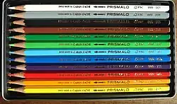 Colored pencils, or pencil crayons, have wax-like cores with pigment and other fillers. Several colors are sometimes blended together.[39]
