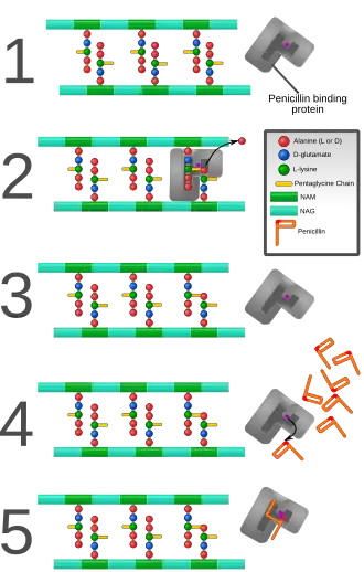 - ^ a b Zapun A, Contreras-Martel C, Vernet T (March 2008). "Penicillin-binding proteins and beta-lactam resistance". FEMS Microbiology Reviews. 32 (2): 361–85. Bibcode:2008FEMMR..32..361Z. doi:10.1111/j.1574-6976.2007.00095.x. PMID 18248419.