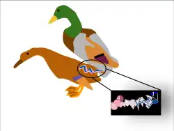 While most male birds have no external genitalia, male waterfowl (Anatidae) have a phallus. Most birds mate with the males balancing on top of the females and touching cloacas in a "cloacal kiss"; this makes forceful insemination very difficult. The phallus that male waterfowl have evolved everts out of their bodies (in a clockwise coil) and aids in inseminating females without their cooperation.[9] The male waterfowl evolution of a phallus to forcefully copulate with females has led to counteradaptations in females in the form of vaginal structures called dead end sacs and clockwise coils. These structures make it harder for males to achieve intromission. The clockwise coils are significant because the male phallus everts out of their body in a counter-clockwise spiral; therefore, a clockwise vaginal structure would impede forceful copulation. Studies have shown that the longer a male's phallus is, the more elaborate the vaginal structures were.[9]