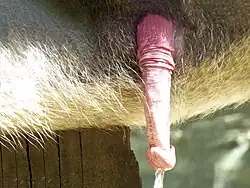 The male genitalia of mouse deer are similar to those of pigs.[34] A boar's penis, which rotates rhythmically during copulation,[35] is about 46 cm (18 in) long, and ejaculates about a pint of semen.[36] Wild boars have a roughly egg-sized sack near the opening of the penis, which collects urine and emits a sharp odour. The purpose of this is not fully understood.[37]