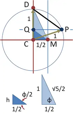 To determine the length of this side, the two right triangles DCM and QCM are depicted below the circle. Using Pythagoras' theorem and two sides, the hypotenuse of the larger triangle is found as . Side h of the smaller triangle then is found using the half-angle formula: