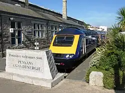 Penzance railway station is sited at the eastern end of Market Jew Street and close to the harbour; it is the southernmost station on the UK mainland rail network. The station is the western terminus of the Cornish Main Line, which runs above the beach to Marazion; this affords passengers good views of St. Michael's Mount and Mount's Bay.