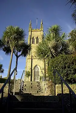 Dominating the skyline above the harbour is the present church of St Mary's. A St Mary's Chapel is mentioned in a 1548 document which states that it was founded by Sir Henry Tyes, Knight, Lord of the Manor of Alverton, who gave a £4 stipend for a priest.[25] There is an earlier document from 1379, when Bishop Brantyngham licensed for services "the chapel of Blessed Mary of Pensande".[26] At this date it was a chapel of ease to the parish church at Madron.[7] Further evidence of historical settlement from this period is in the St Clare area of the town, where a chapel existed to St Clare or Cleer. The earliest reference is a lease of 1584: "...a certain chapel situate below the high road between Pensaunce and Madderne."[27] In the early part of the 19th century the foundations of a building, said to be the chapel, was discovered, and enough was exposed to show the shape of the building.[28] An episcopal licence cannot be traced for this chapel.[7] The name, St Clare, lives on in the town as "St Clare Street", which is part of the road from Penzance to Madron, and the St Clare cricket ground at the top of the hill.