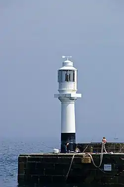 At the same time as the railway was being built more improvements were being made to the harbour, with a second pier on the eastern side of the harbour, the Albert Pier, completed in 1853 to provide even better shelter for shipping.[40] At the same time the Old Pier was also extended, and a lighthouse was built on it (replacing an earlier light), commissioned in 1855. The lighthouse (which was originally lit by an oil lamp within a fifth-order Fresnel lens) was built by Sandys & co. of Hayle and displayed a fixed red or green light, depending on the height of the tide.[61] It remains operational, displaying a flashing sector light, which is visible up to 17 nmi (31 km; 20 mi) out to sea.[62]