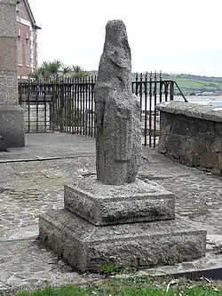 The first mention of the name Pensans is in the Assize Roll of 1284,[22] and the first mention of the actual church that gave Penzance its name is in a manuscript written by William Borlase in 1750: ″The ancient chapel belonging to the town of Penzance may be seen in a fish cellar, near the key; it is small and as I remember had the image of the Virgin Mary in it.″[23] The chapel was built of greenstone and about 30 ft in length and 15 ft in breadth of which only a fragment remained in situ. In around 1800 the chapel was converted to a fish cellar. A carving in "Ludgvan granite" thought to be of St Anthony was removed in about 1830 and was used in the wall of a pig sty, which was further vandalised in 1850 when "a stranger ... taking fancy to the stony countenance and rough hands, they were broken off and carried away as relics ...". The remains of the vandalised relic were taken to St Mary's Churchyard by a mason who told Mr Millett that he "popped St Raffidy into a wheelbarrow and trundle him off to the chapel yard."[24] The carving remains in St Mary's Churchyard and has been dated by Prof Charles Thomas as early 12th century. There are no early documents mentioning the dedication to St Anthony; this seems to depend entirely on tradition and may be groundless. A licence for Divine Service in the Chapel of St Gabriel and St Raphael was granted in 1429, but nothing more is known of this chapel except, possibly, for the mason who mentioned ″St Raffidy″ in 1850. Adjoining the chapel is St Anthony's Gardens, named in 1933 and containing an archway said to have been taken from the chapel site.[7]