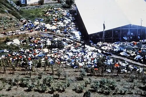 In 1974, the Peoples Temple signed a lease to rent land in Guyana.[122] The community which was established on this piece of property was named the Peoples Temple Agricultural Project, informally dubbed "Jonestown". The settlement had as few as fifty residents in early 1977.[123]