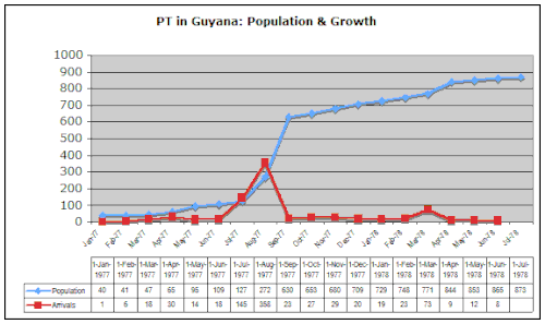 While still on the phone listening to the allegations contained in the article, Jones wrote a note to Temple members in the room with him that said, "We leave tonight. Notify Georgetown (Guyana)."[127] After Jones left for Guyana, he encouraged Temple members to follow him there. The population grew to about a thousand people by late 1978.[123][128] Those who moved there were promised a tropical paradise free from the supposed wickedness of the outside world.[129]