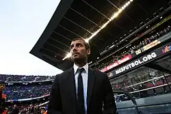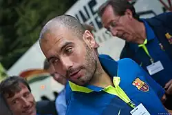 Guardiola's playing style, which relied on creativity, technique and ball movement, rather than physicality and pace, inspired several future diminutive Spanish playmaking midfielders, such as Xavi,[46][47] Andrés Iniesta,[48] and Cesc Fàbregas, with the latter describing him as his "idol".[49] Pirlo instead described Guardiola as the "model" for the position which he himself occupied deep in midfield.[47] Former Barcelona president Joan Laporta once described Guardiola as "the best central midfielder in our history."[50] Johan Cruyff considered him to be one of the best midfielders of his generation,[51] a view echoed by Richard Jolly of FourFourTwo and Marco Frattino, the latter of whom stated in 2018: "Twenty years ago, [...] Pep Guardiola was one of the best midfielders in the world."[52][53] In 2001, his agent Josè Maria Orobitg described him as the best in the world at dictating the tempo and rhythm of his team's play.[38]