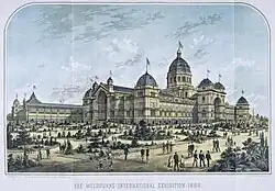After Pabst returned to Europe in the autumn of 1894, Grainger's new piano tutor, Adelaide Burkitt, arranged for his appearances at a series of concerts in October 1894 at Melbourne's Royal Exhibition Building. The size of this enormous venue horrified the young pianist; nevertheless, his performance delighted the Melbourne critics, who dubbed him "the flaxen-haired phenomenon who plays like a master".[11] This public acclaim helped Rose to decide that her son should continue his studies at the Hoch Conservatory in Frankfurt, Germany, an institution recommended by William Laver, head of piano studies at Melbourne's Conservatorium of music. Financial assistance was secured through a fund-raising benefit concert in Melbourne and a final recital in Adelaide, after which mother and son left Australia for Europe on 29 May 1895.[12] Although Grainger never returned permanently to Australia, he maintained considerable patriotic feelings for his native land,[13] and was proud of his Australian heritage.[1]