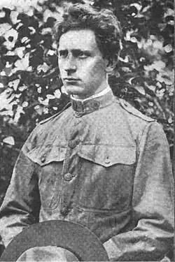 In April 1914 Grainger gave his first performance of Delius's piano concerto, at a music festival in Torquay. Thomas Beecham, who was one of the festival's guest conductors, reported to Delius that "Percy was good in the forte passages, but made far too much noise in the quieter bits".[46] Grainger was receiving increasing recognition as a composer; leading musicians and orchestras were adding his works to their repertoires.[44] His decision to leave England for America in early September 1914, after the outbreak of the First World War, damaged his reputation among his patriotically minded British friends.[1] Grainger wrote that the reason for this abrupt departure was "to give mother a change" – she had been unwell for years.[47] However, according to Bird, Grainger often explained that his reason for leaving London was that "he wanted to emerge as Australia's first composer of worth, and to have laid himself open to the possibility of being killed would have rendered his goal unattainable".[48] The Daily Telegraph music critic Robin Legge accused him of cowardice, and told him not to expect a welcome in England after the war,[7] words that hurt Grainger deeply.[49]