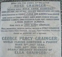 Grainger died in the White Plains hospital on 20 February 1961, at the age of 78. His remains were buried in the Aldridge family vault in the West Terrace Cemetery, alongside Rose's ashes.[7] Ella survived him by 18 years; in 1972, aged 83, she married a young archivist, Stewart Manville. She died at White Plains on 17 July 1979.[1][114]