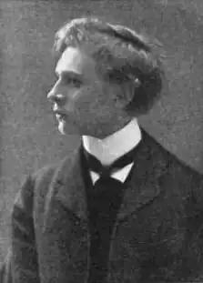 Except for three months' formal schooling as a 12-year-old, during which he was bullied and ridiculed by his classmates, Percy was educated at home.[3] Rose, an autodidact with a dominating presence, supervised his music and literature studies and engaged other tutors for languages, art and drama. From his earliest lessons, Percy developed a lifelong fascination with Nordic culture; writing late in life, he said that the Icelandic Saga of Grettir the Strong was "the strongest single artistic influence on my life".[6][7][8] As well as showing precocious musical talents, he displayed considerable early gifts as an artist, to the extent that his tutors thought his future might lie in art rather than music.[9] At the age of 10 he began studying piano under Louis Pabst, a German-born graduate of the Moscow Conservatory, Melbourne's leading piano teacher. Grainger's first known composition, "A Birthday Gift to Mother", is dated 1893.[1] Pabst arranged Grainger's first public concert appearances, at Melbourne's Masonic Hall in July and September 1894. The boy played works by Bach, Beethoven, Schumann and Scarlatti, and was warmly complimented in the Melbourne press.[10]