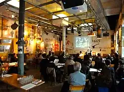 Wardrip-Fruin and Montfort in The New Media Reader, "The term 'Happening' has been used to describe many performances and events, organized by Allan Kaprow and others during the 1950s and 1960s, including a number of theatrical productions that were traditionally scripted and invited only limited audience interaction."[87] A happening allows the artist to experiment with the movement of the body, recorded sounds, written and talked texts, and even smells. One of Kaprow's first works was Happenings in the New York Scene, written in 1961.[88] Allan Kaprow's happenings turned the public into interpreters. Often the spectators became an active part of the act without realizing it. Other actors who created happenings were Jim Dine, Al Hansen, Claes Oldenburg, Robert Whitman and Wolf Vostell: Theater is in the Street (Paris, 1958).[89][90]