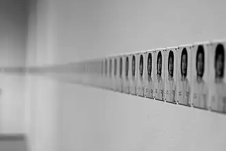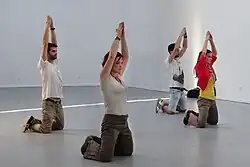 Endurance performance art explores themes such as trance, pain, solitude, the deprivation of freedom, isolation, and exhaustion.[147] Works that unfold over extended periods of time are often classified as long-durational performances.[148] One of the pioneering figures of this approach was Chris Burden, active in this form of performance art during much of the 1970s.[149] In one of his best known works, Five Day Locker Piece (1971) he stayed for five days inside a school locker, in Shoot (1971) he was shot with a firearm, and in Bed Piece (1972) he stayed in bed in an art gallery for twenty two days straight.[150] Another example of an endurance artist is Tehching Hsieh. During a performance created in 1980–1981 (Time Clock Piece), Hsieh took a photo of himself next to a time clock installed in his studio every hour for an entire year. Hsieh is also known for his performances about deprivation of freedom; he spent an entire year confined.[151] Another practitioner of long-durational performance is Bryan Lewis Saunders, whose project Under the Influence (1995–present) involves creating daily self-portraits during states of altered perception,[152] and who in 30 Days Totally Blind (2018) spent a month in complete self-imposed blindness, during which he continued to produce daily self-portraits.[153] In The House With the Ocean View (2003), Marina Abramović lived silently for twelve days without food.[154] The Nine Confinements or The Deprivation of Liberty, is a series of conceptual endurance performances by artist Abel Azcona, created between 2013 and 2016, each addressing the illegitimate deprivation of freedom.