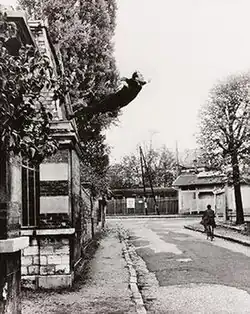 Nouveau réalisme is another one of the artistic movements cited in the beginnings of performance art. It was a painting movement founded in 1960 by art critic Pierre Restany and painter Yves Klein, during the first collective exhibition in the Apollinaire Gallery in Milan. Nouveau réalisme was, along with Fluxus and other groups, one of the many avant garde tendencies of the 1960s. Pierre Restany created various performance art assemblies in the Tate Modern, amongst other spaces.[47] Yves Klein is one of the main exponents of the movement. He was a clear pioneer of performance art, with his conceptual pieces like Zone de Sensibilité Picturale Immatérielle (1959–62), Anthropométries (1960), and the photomontage Saut dans le vide.[48][49] All his works have a connection with performance art, as they are created as a live action, like his best-known artworks of paintings created with the bodies of women. The members of the group saw the world as an image, from which they took parts and incorporated them into their work; they sought to bring life and art closer together.[50][51][52]